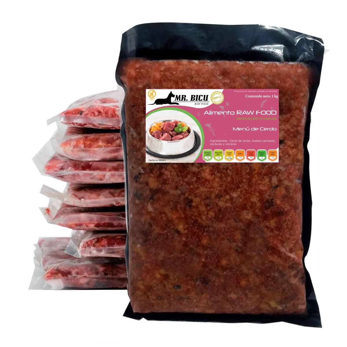 Se conforma por productos crudos cárnicos, solo cerdo, vísceras, hueso carnoso y vegetales que cubren las necesidades nutricionales de tu mascota.